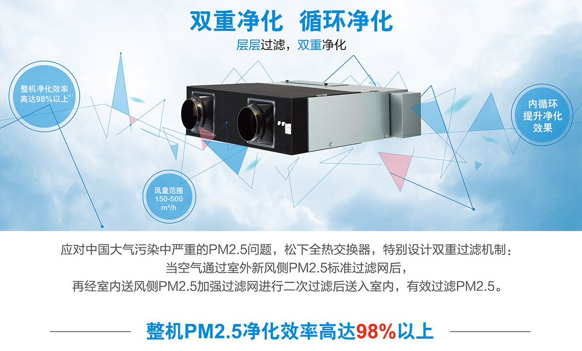 雙重凈化,循環(huán)凈化,雙重過濾,整機凈化率98%以上,智能控制,手機APP&RS485對應(yīng),風(fēng)量范圍 : 150-500m3/h。