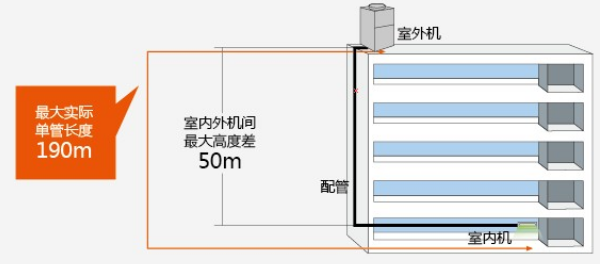 日立新風(fēng)機(jī)最大單管長度增加到190米,室內(nèi)機(jī)與室外機(jī)的高度差可達(dá)50米,方便安裝。