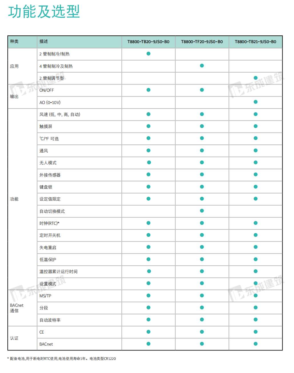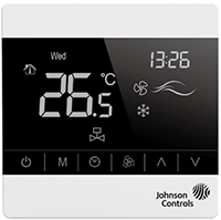 產(chǎn)品概述 T8800 觸摸屏溫控器有三種基本型號,滿足所有類型風機盤管控制應用。有2管制冷暖型、4管制冷暖型,控制2線閥門。內(nèi)置高精度NTC傳感器使受控區(qū)域溫度 控制精確和舒服。 T8800 溫控器有24小時定時功能,用戶可根據(jù)自己的需要安排開啟或關閉定時功能。88x88mm尺寸可方便安裝在75x75x35mm標準墻裝盒上。適合任何室內(nèi)裝潢. Model T8800-TB20-9JS0-B0 型號 型號T8800-TB20-9JS0-B0, LCD顯示(有背光)風機盤管溫控器是為2管制冷暖風機盤管設計的, 用于2線電動閥門控制,有系統(tǒng)開關按鈕,用戶可關閉T8800溫控器, 切斷風機輸出電源(切斷閥門執(zhí)行器輸出電源)。僅需按風速按鈕, 用戶可選擇自動-高-中-低風速。所有風機繼電器輸出具有標準最大 5Amp (阻性)工作電流。 有干觸點有無人模式, 使控制更為舒適且更為節(jié)能。 T8800-TB20-9JS0-B0 可連接外置10K NTC 傳感器(需單獨訂購), 當連接外置傳感器時內(nèi)置的NTC傳感器自動失效。 Model T8800-TF20-9JS0-B0 型號 型號T8800-TF20-9JS0-B0, LCD顯示(有背光)風機盤管溫控器是為4管制冷暖風機盤管設計的, 用于2線電動閥門控制, 有系統(tǒng)開關按鈕, 用戶可關閉T8800溫控器, 切斷風機輸出電源(切斷閥門執(zhí)行器輸出電源)。僅需按風速按鈕,用戶可選擇自動-高-中-低風速。所有風機繼電器輸出具有標準最大 5Amp (阻性)工作電流。 有干觸點有無人模式, 使控制更為舒適且更為節(jié)能。 T8800-TF20-9JS0-B0 可連接外置10K NTC 傳感器(需單獨訂購), 當連接外置傳感器時內(nèi)置的NTC傳感器自動失效。 Model T8800-TB21-9JS0-B0 型號 型號T8800-TB21-9JS0-B0, LCD顯示(有背光)風機盤管溫控器是為2管制冷暖風機盤管設計的, 用于2線調(diào)節(jié)閥門控制,有系統(tǒng)開關按鈕, 用戶可關閉T8800溫控器, 切斷風機輸出電源(切斷閥門執(zhí)行器輸出電源)。僅需按風速按鈕, 用戶可選擇自動-高-中-低風速。所有風機繼電器輸出具有標準最大 5Amp (阻性)工作電流。 有干觸點有無人模式, 使控制更為舒適且更為節(jié)能。 T8800-TB21-9JS0-B0 可連接外置10K NTC 傳感器(需單獨訂購), 當連接外置傳感器時內(nèi)置的NTC傳感器自動失效。 |