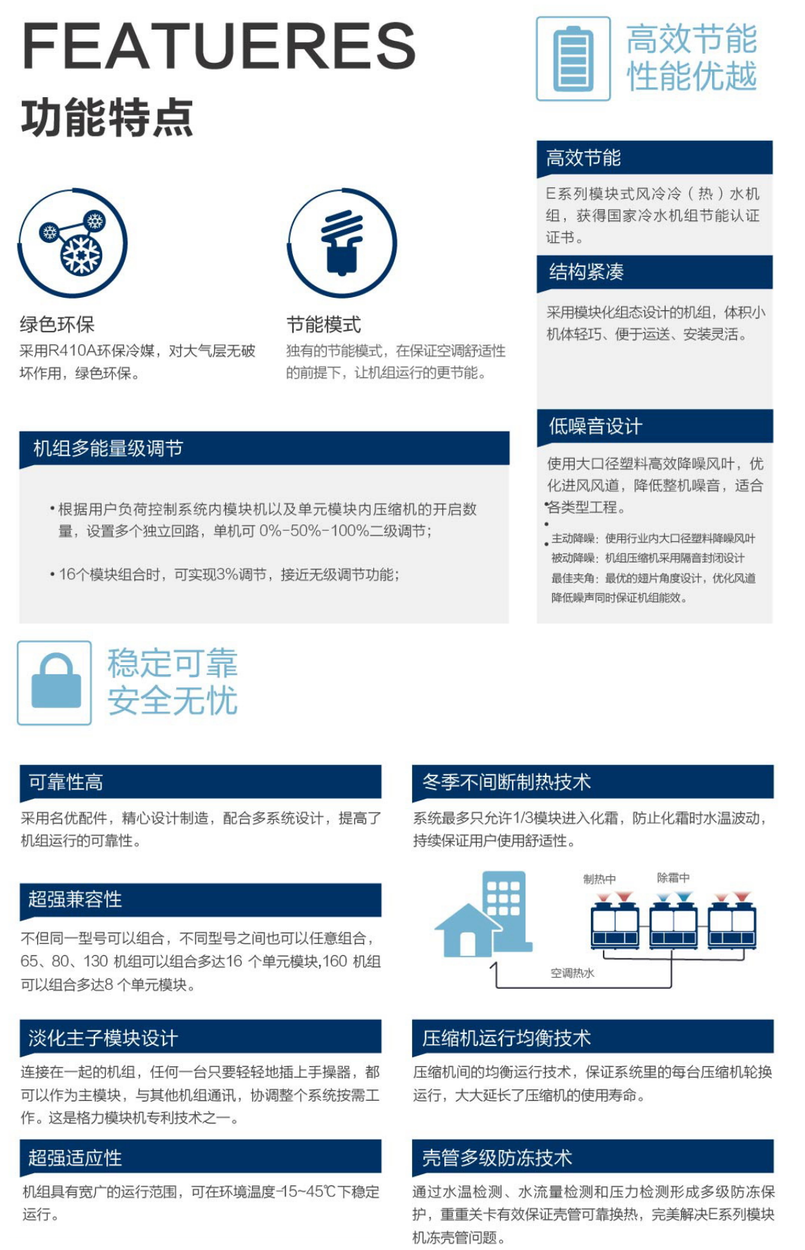 產(chǎn)品概述 格力E系列模塊式風(fēng)冷冷(熱)水機(jī)組?格力在D系列模塊式風(fēng)冷冷(熱)水機(jī)組的基礎(chǔ)上,不斷開(kāi)拓創(chuàng)新,開(kāi)發(fā)岀新一代?節(jié)能環(huán)保產(chǎn)品:E系列模塊式風(fēng)冷冷(熱)水機(jī)組。該機(jī)組可組合多個(gè)單元模塊,?每個(gè)單元模塊的名義制冷量不同,有65kW、80kW、130kW. 160kW 可選。?65、80、130機(jī)組每個(gè)單元模塊有兩個(gè)完全獨(dú)立的制冷系統(tǒng),160 贈(zèng)每個(gè)單元?模塊有四個(gè)完全獨(dú)立的制冷系統(tǒng)。通過(guò)組合1 ~ 16個(gè)相同或不同的單元模塊,機(jī)?組形成制冷量在65 ~ 2080kW范圍的系列產(chǎn)品。65、80、130機(jī)組可以組合多?達(dá)16個(gè)單元模塊,160機(jī)組可以組合多達(dá)8個(gè)單元模塊。?E系列模塊式風(fēng)冷冷(熱)水機(jī)組廣泛應(yīng)用于新建和改建的大小2DIE與民用建筑空?調(diào)工程。對(duì)噪音和周?chē)h(huán)境有較高要求、不便安裝冷卻塔的工程,模塊式風(fēng)冷冷?(熱)水機(jī)組更是您理想的選擇。 |